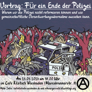 25.05 Wiesbaden: Für ein Ende der Polizei Warum wir die Polizei nicht reformieren können und wie gemeinschaftliche Verantwortungsübernahme aussehen kann – um 18.00 Uhr im Cafe Klatsch Wiesbaden (Marcobrunnerstr. 9).