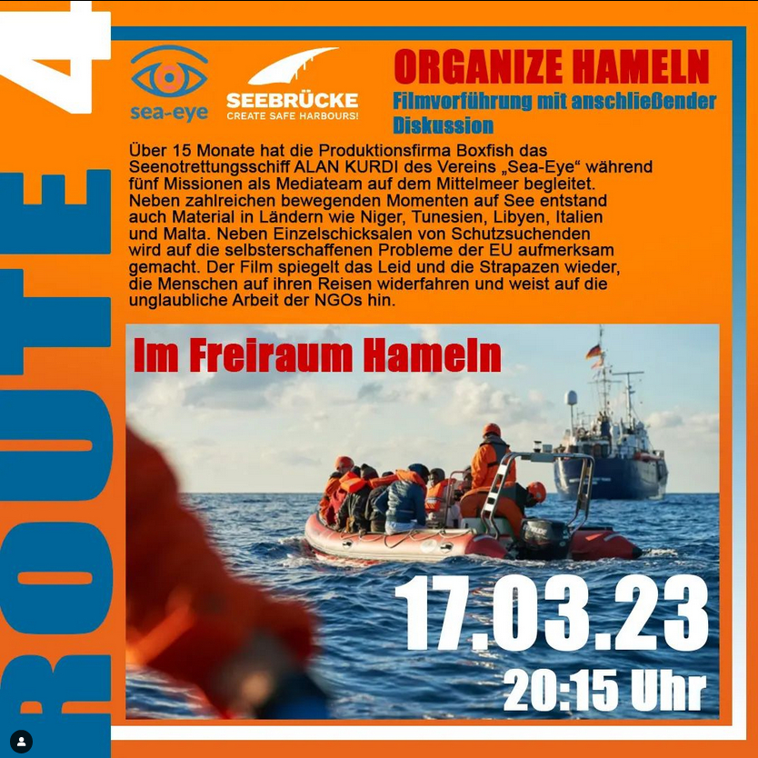 Am Freitag, den 17.03.2023, wollen wir uns ab 20:15 Uhr im freiraum Hameln (Walkemühle 1a, 31785 Hameln) zusammenfinden, um gemeinsam den Film „Route 4“ über das Seenotrettungsschiff „Alan Kurdi“ anzuschauen. Kommt gerne rum und disktutiert im Anschluss mit uns.