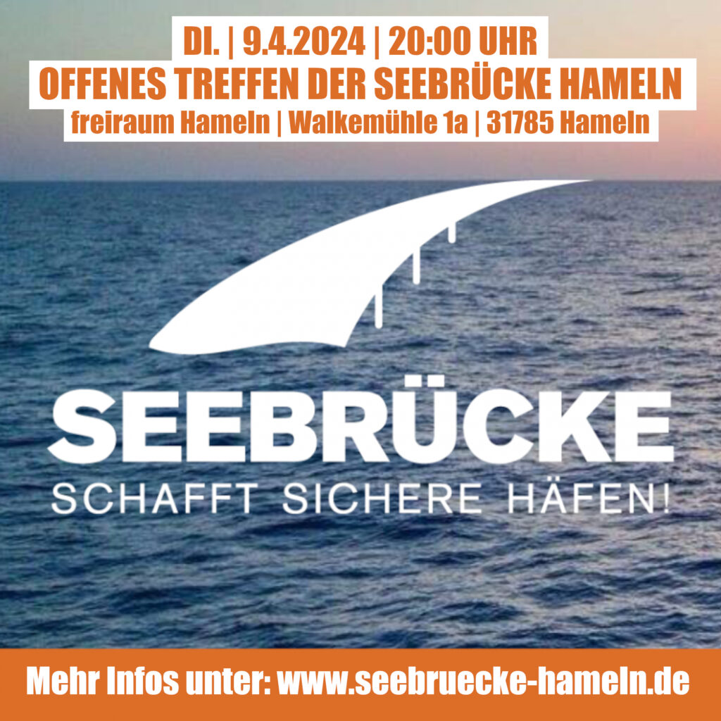 Am Dienstag, den 9.4.2024, findet im freiraum Hameln (Walkemühle 1a, 31785 Hameln) ab 20 Uhr das nächste offene Treffen der Seebrücke Hameln statt.