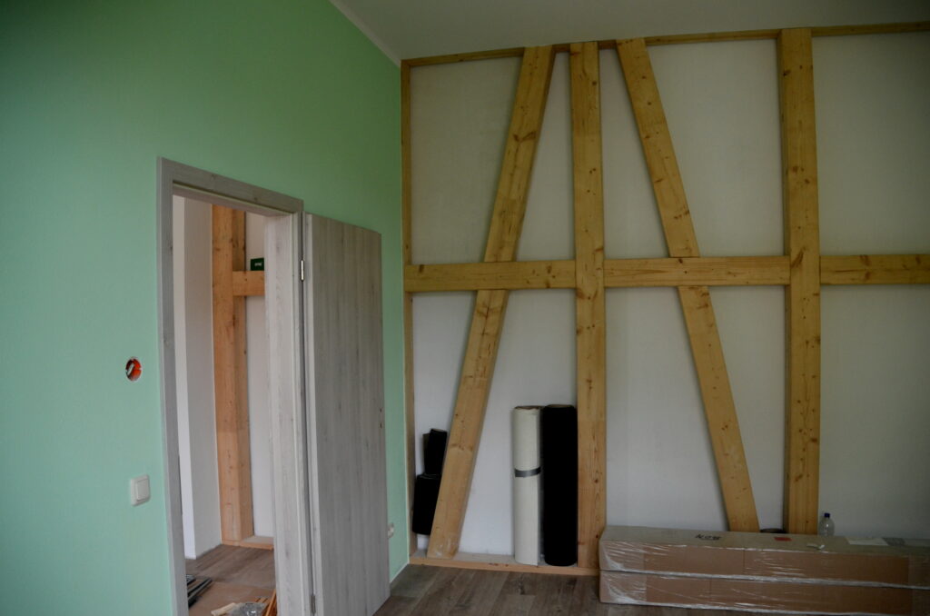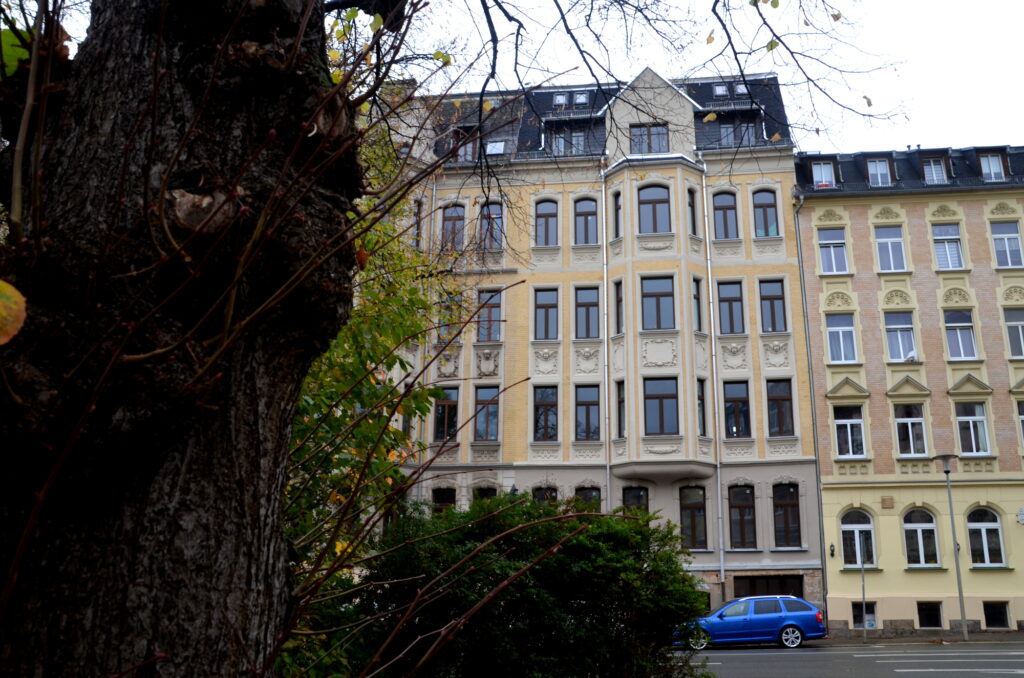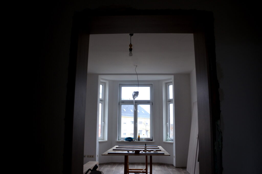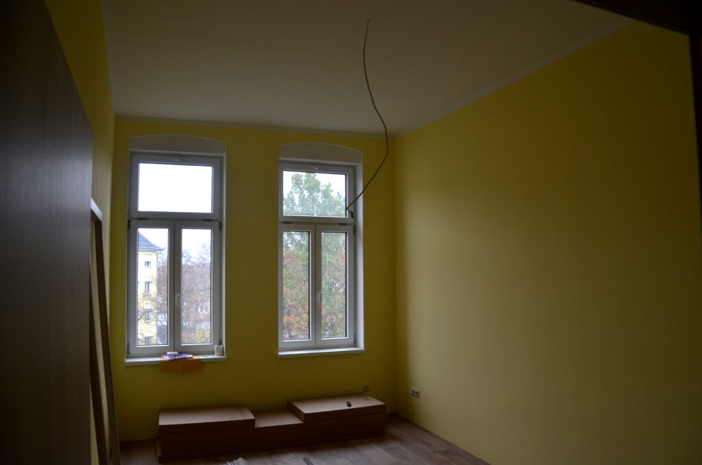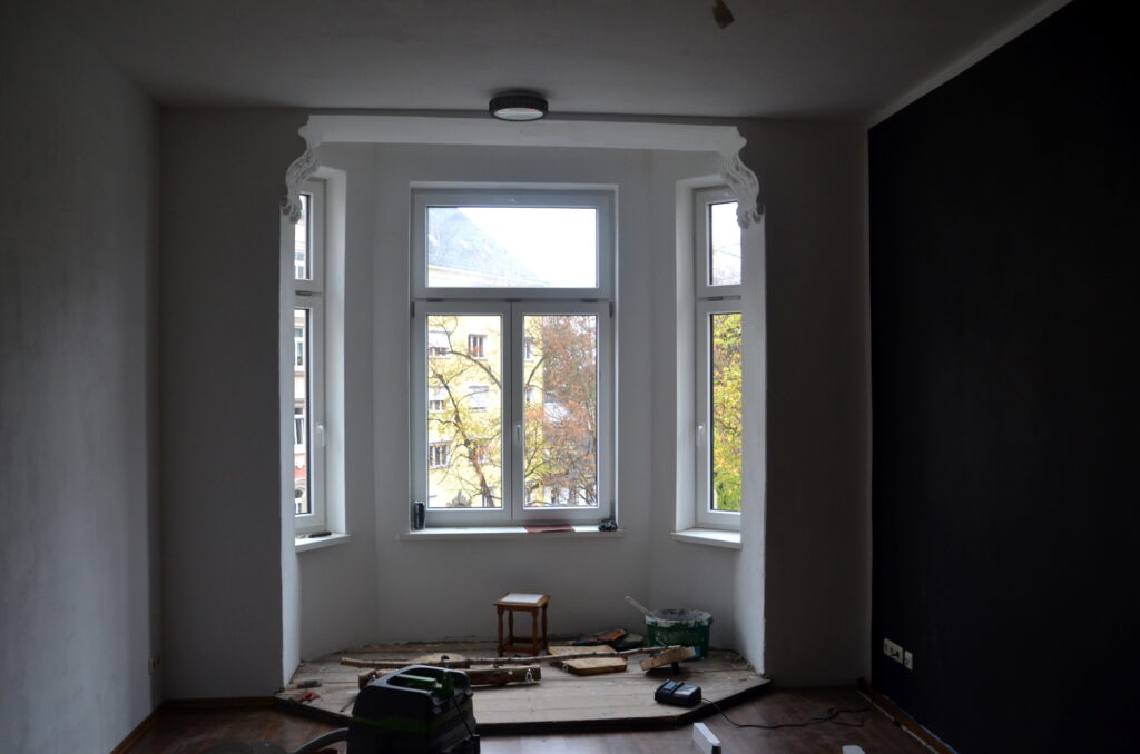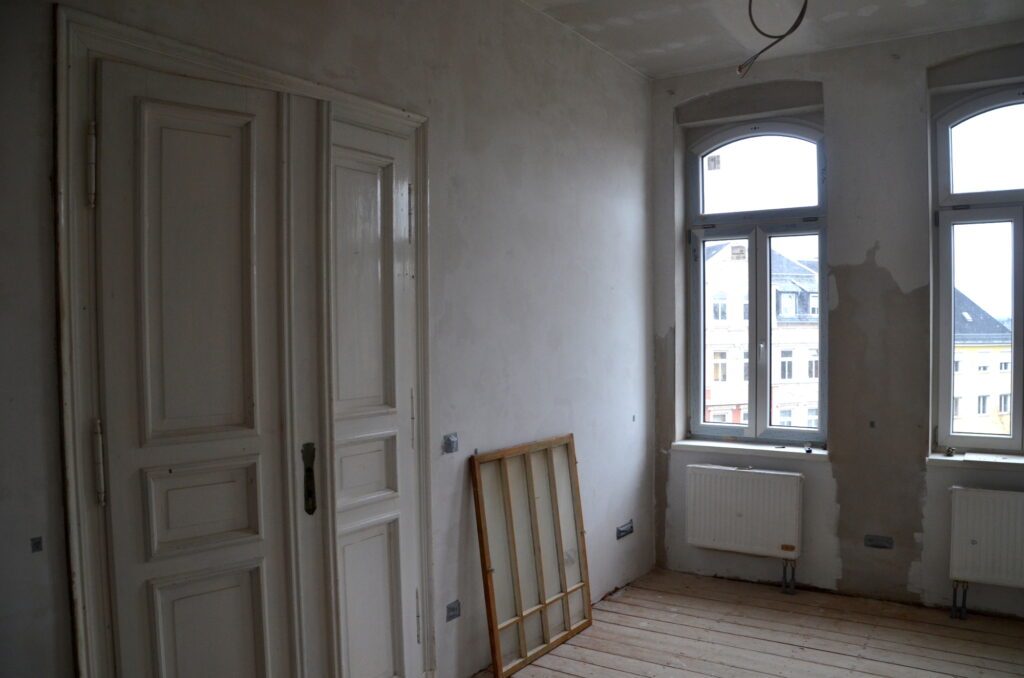 Neue Fassade – das einzugsfertige Haus!Die alten Jugenstilzimmer sind nun endlich hergerichtet und werden wieder bewohnt!Wohnung von innen – die alten Türrahmen wurden wieder aufgearbeitet!Offen liegende Balkenkonstruktion im Hinterhaus.Letzte Vorkehrungen für den Einbau der Türen.Ein weiteres Zimmer erstrahlt in neuem Glanz!