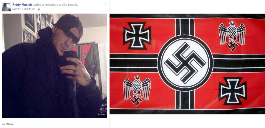 Another member is named Bradley “Riddy” Musich (33) and while he’s more cautious than Cody, he also has his own share of nazi material including the image of the Nazi battle flag being visible in a selfie of his bedroom, and sharing an image of the Nazi Totenkopf symbol with sunglasses on it.