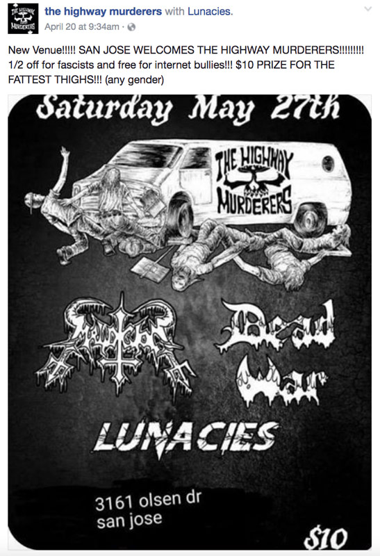 For the past months, members of the band and south bay area neo-nazi Nick Sherman have been working hard to get the band booked for a show at a south bay venue. Initially, the band was scheduled for a show at Back Bar in San Jose on May 27th, and even had a flyer produced for their show which depicts a van bearing the band’s logo running over a group of protesters holding signs. This image is a clear reference to the right-wing threats and carried out attacks involving running down protesters for movements such as Black Lives Matter which engage in protest tactics like highway shutdowns.