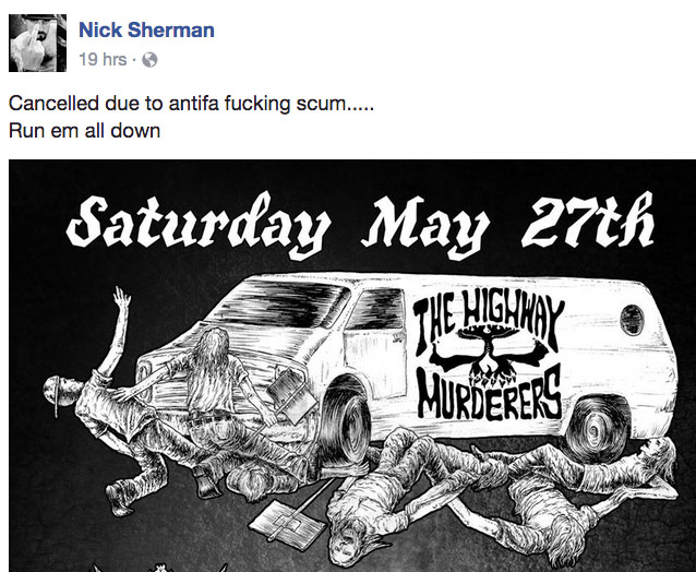 After the cancellation, Sherman took to Facebook to express his anger, claimed that threats from “antifa” had caused the show’s cancellation, and said that anti-fascists should be “run down.” This, despite the fact that no organized antifa or other anti-racist groups had intervened in the shutdown. While many in the South Bay music scene identify with anti-racist and anti-fascist politics, the initial cancellation was simply the result of people effectively putting the band and venue on blast on social media, rather than there being any threats made as claimed by Sherman.
