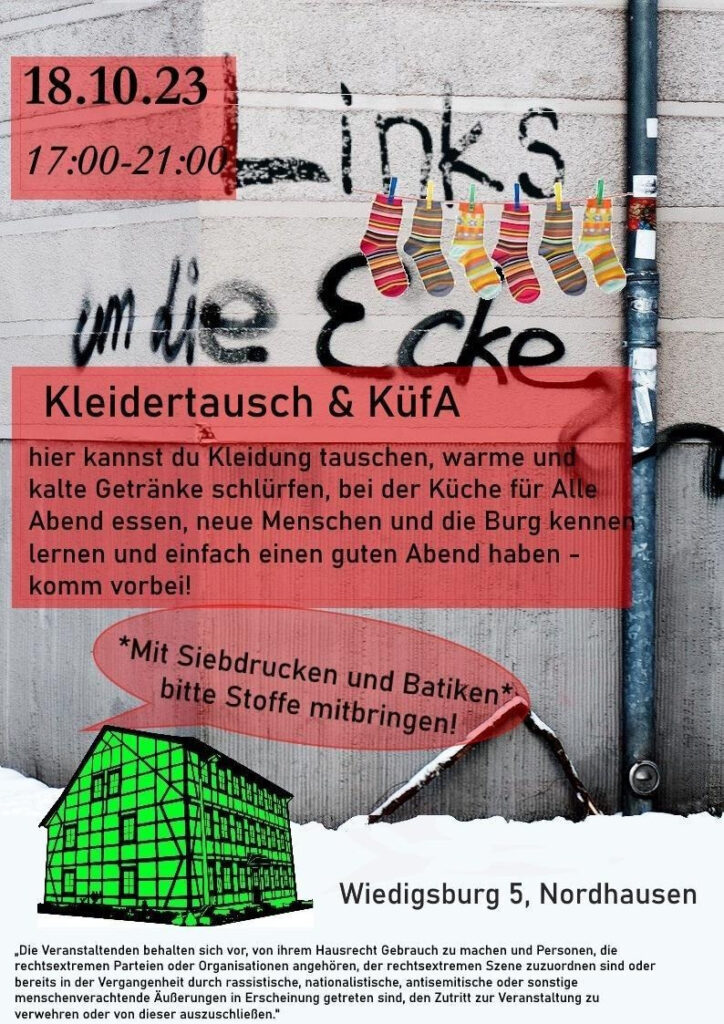 In Thüringen, Sachsen, Baden-Württemberg, Hamburg und in Niedersachsen kam es am Mittwoch, den 08.11.23, wieder einmal zu Hausdurchsuchungen bei Antifa’s. Neben 9 weiteren Gebäuden in Thüringen wurden in Nordhausen Wohn- und Lebensräume oberhalb des linken Kultur-Freiraumprojektes ‚GreenIsland‘ durchsucht.