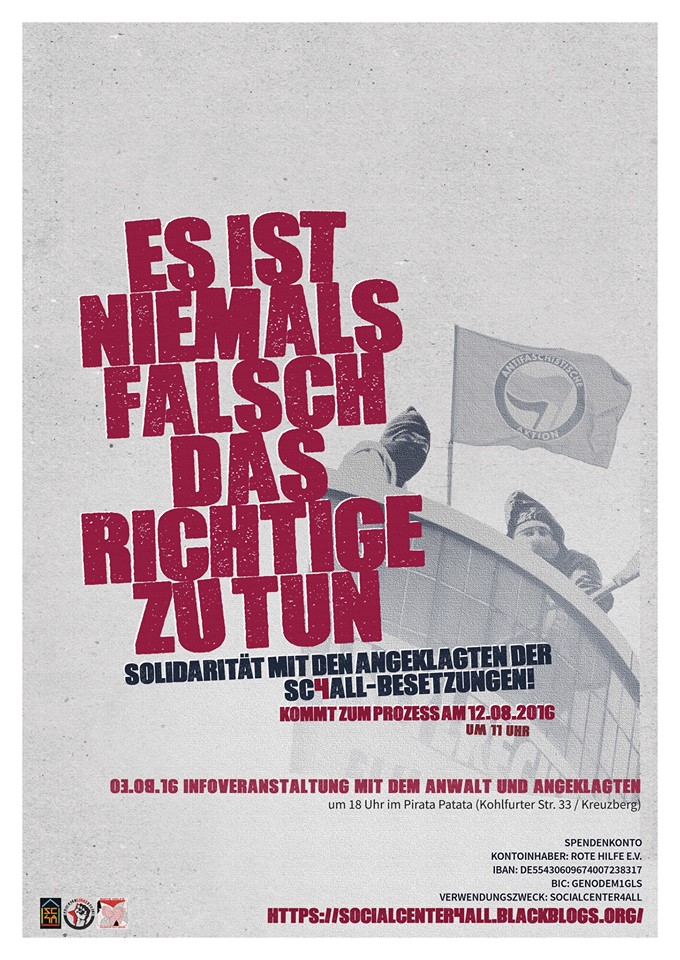 Für alle die erst später Zeit haben gibt es ab 20Uhr im Bethanien einen Soli Tresen für das Social Center. Hier können wir uns weiter kennen lernen und über unsere Ideen sprechen.