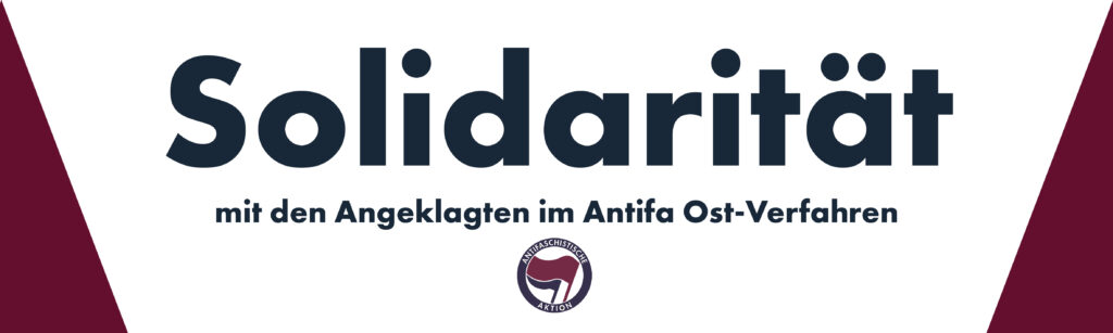 Wir solidarisieren uns mit allen Antifaschist:innen, die von staatlicher Repression überzogen werden. Egal wie genau das Urteil im Antifa Ost Verfahren ausfällt, wir stehen Schulter an Schulter neben unseren Freund:innen! Wir grüßen alle Antifas hinter Gittern – ob in Dresden, Leipzig, Budapest oder Stuttgart!