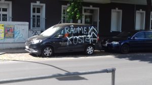 „Räumen kostet! Wir haben in der Nacht vom 6. zum 7. Juni zwei Firmenautos der Aachener Siedlungs- & Wohnungsgesellschaft (ASW) angegriffen. Mit der Aktion erklären wir uns solidarisch mit der Großbeerenstraße 17a, die seit September 2018 besetzt war und kürzlich im Auftrag der ASW von der Polizei geräumt wurde. (…)“