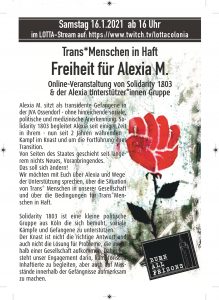 Alexia M. Sitzt als transidente Gefangene in der JVA Ossendorf – ohne Hinreichende soziale, politische sowie medizinische Anerkennung. Solidarity 1803 begleitet Alexia seit einiger Zeit in ihrem – nun seit zwei Jahren währenden Kampf im Knast und um die Fortführung ihrer Transition. Von Seiten des Staats passiert seit längerem nicht Neues, Voranbringendes. Das soll sich ändern. Wir möchten mit über Alexia und Wege der Unterstützung sprechen, über die Situation von Trans*Menschen in unserer Gesellschaft und über die Bedingungen für Trans*Menschen in Haft.