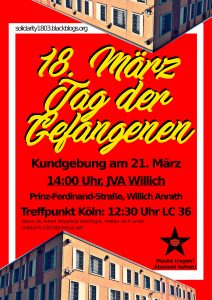 Zum 18. März, dem sogenannten „Tag der Gefangenen“, möchten wir mit Euch vor den Mauern der JVA Willich Anrath richtig Lärm machen. Wir reisen mit einer fetten Anlage an, damit uns die Gefangenen auch gut hören können. Die Kundgebung ist vor den Mauern des Frauen-Traktes angemeldet. Für uns ist das nicht die erste Kundgebung vor der JVA Willich. In den letzten Jahren waren wir schon einige Male dort und wir konnten uns mit lautem Rufen über die Mauer hinweg mit den Gefangenen verständigen.