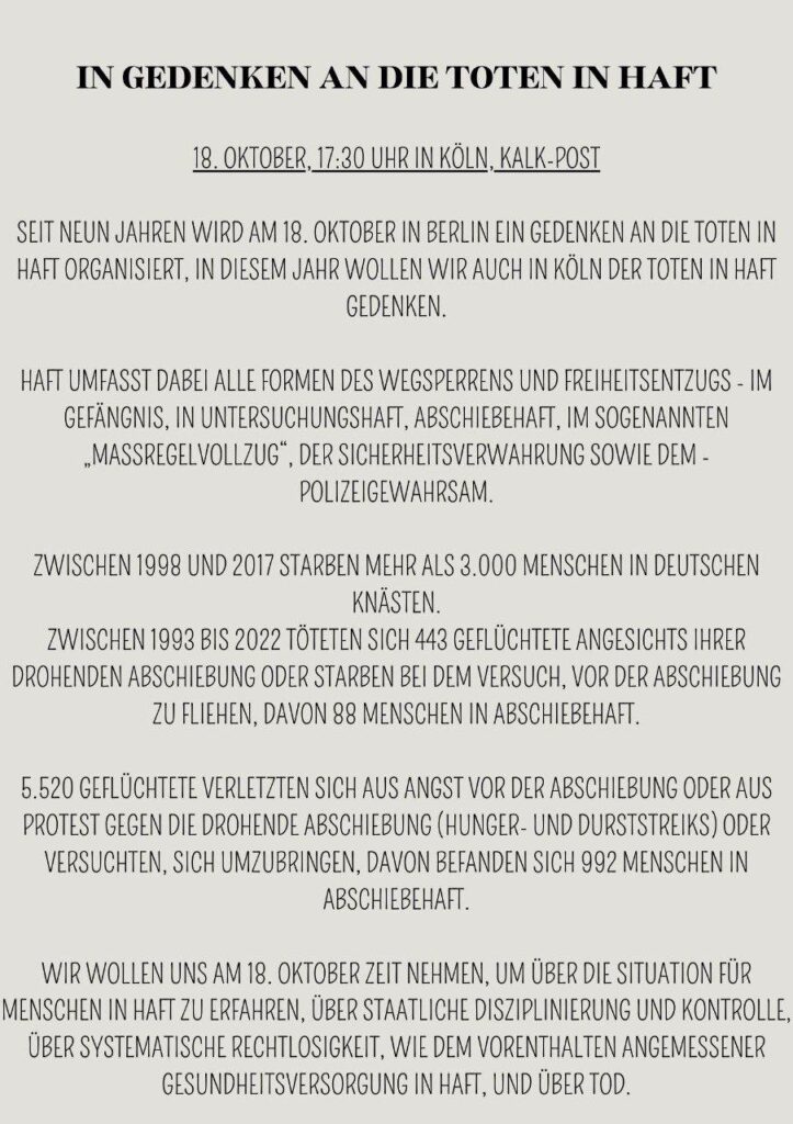 18.10. Gedenktag an die Toten in Haft