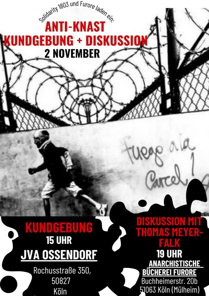 Danach laden wir euch alle herzlich zum Diskussionsabend über Knast und Widerstand um 19 Uhr in die anarchistische Bücherei „Furore“ in der Buchheimer Strasse 20b in Köln Mülheim ein!