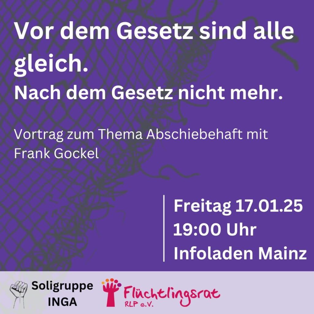 // english version below //Die Soligruppe Inga und der Flüchtlingsrat Rheinland-Pfalz laden euch herzlich zu unserem Vortragsabend zum Thema Abschiebehaft mit Frank Gockel am 17.01.2025 um 19:00 Uhr im Infoladen Ella Janecek (Zanggasse 12) in Mainz ein.