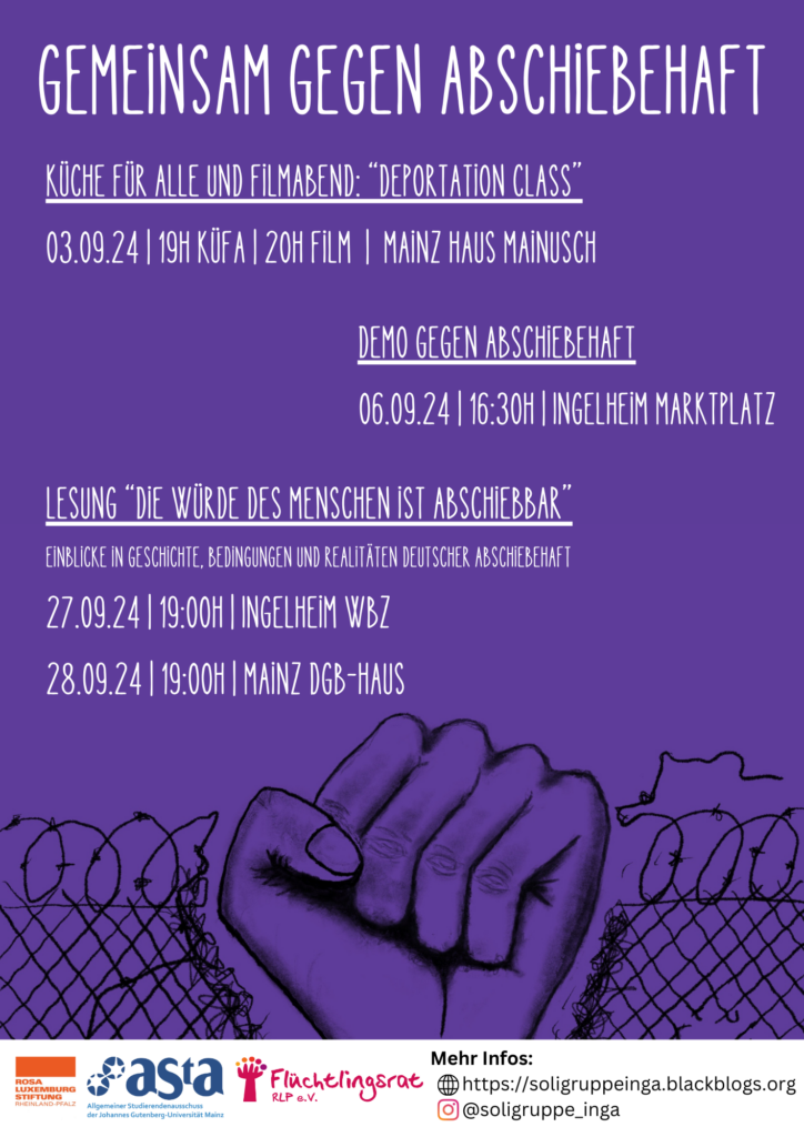Weiter geht es dann am Freitag, den 06.09. um 16:30 Uhr in Ingelheim aufm Markplatz (Sebastian-Münster-Platz), wo wir mit unserer Demo gegen Abschiebehaft starten und dann gemeinsam zum Abschiebeknast ziehen!