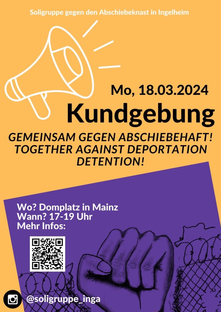 english below Am 18.03. – dem Tag der politischen Gefangenen – machen wir um 17 Uhr eine Kundgebung auf dem Domplatz in Mainz, um das rassistische Unrecht des Abschiebeknast in Ingelheim sichtbar zu machen.
