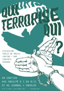 Le 8 décembre 2020, la DGSI enlevait 9 militant·es libertaires prétextant une « opération antiterroriste ». Ce « coup de filet dans « l’ultragauche » est un montage médiatique, juridique et policier qui n’a d’autre but qu’approfondir la militarisation de la répression sur les mouvements contestataires et d’assimiler l’idée de Révolution au Terrorisme.