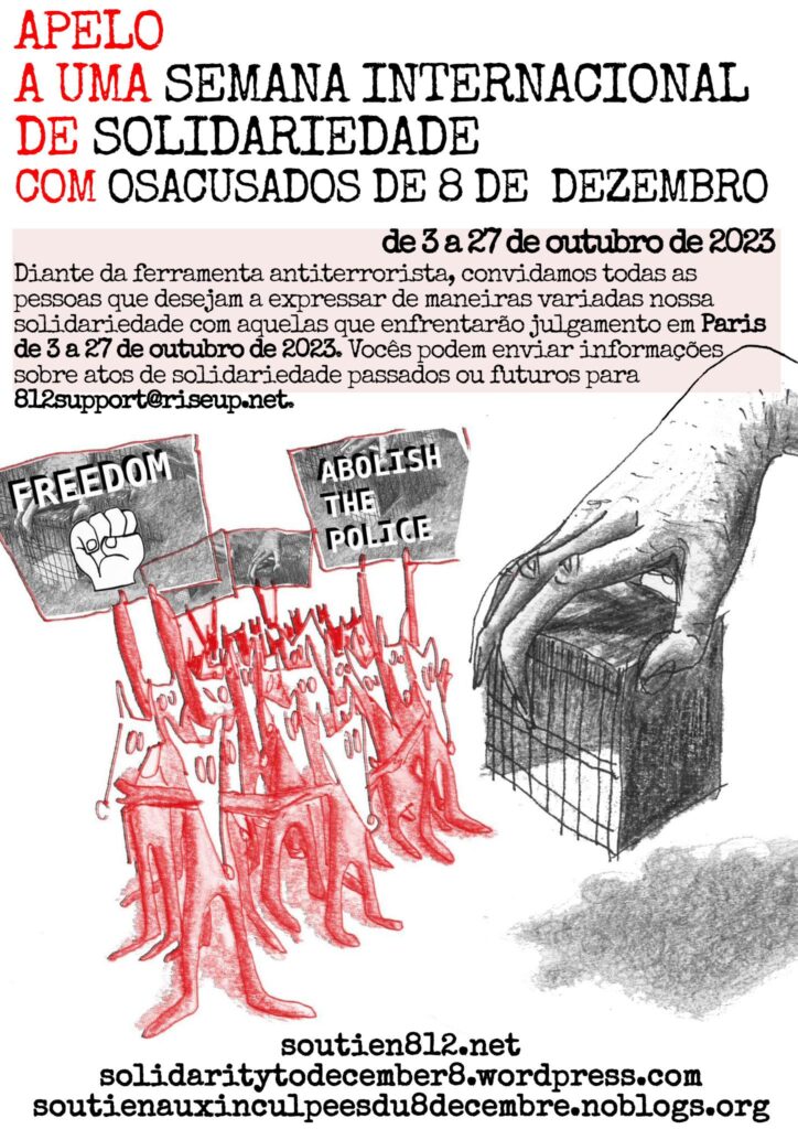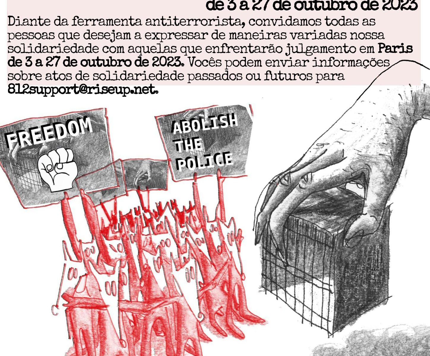 Convidamos você a fazer ressoar nossa determinação e nossa raiva contra o mundo deles de formas diversas, e nossa solidariedade com as pessoas que estarão sendo julgadas em Paris de 3 a 27 de outubro de 2023.