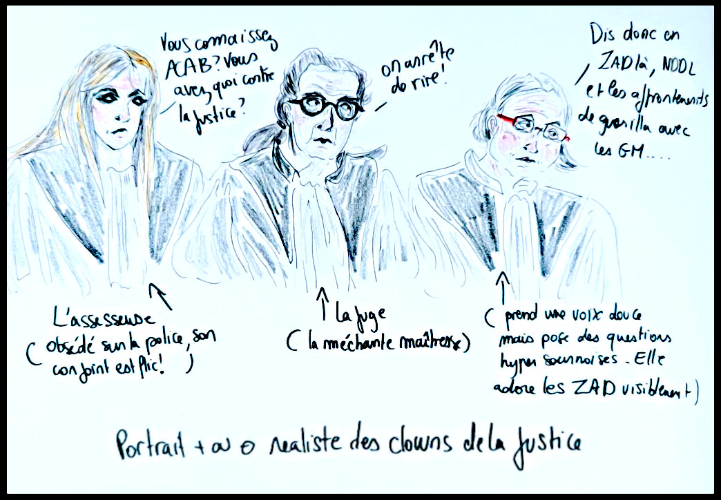 Bouffie d’orgueil, la Présidente constate que la salle n’a pas été totalement évacuée et essaye de réaffirmer son autorité, que plus personne ne considère légitime (même pas les flics on dirait !). Elle prétend que la salle est encore trop pleine, et exige arbitrairement que seules 3 personnes par inculpé·e soient autorisées à rester. Elle lance également : « Je ne rendrai pas le délibéré devant une audience vide ! » Puis les 3 juges repartent, on croit rêver.