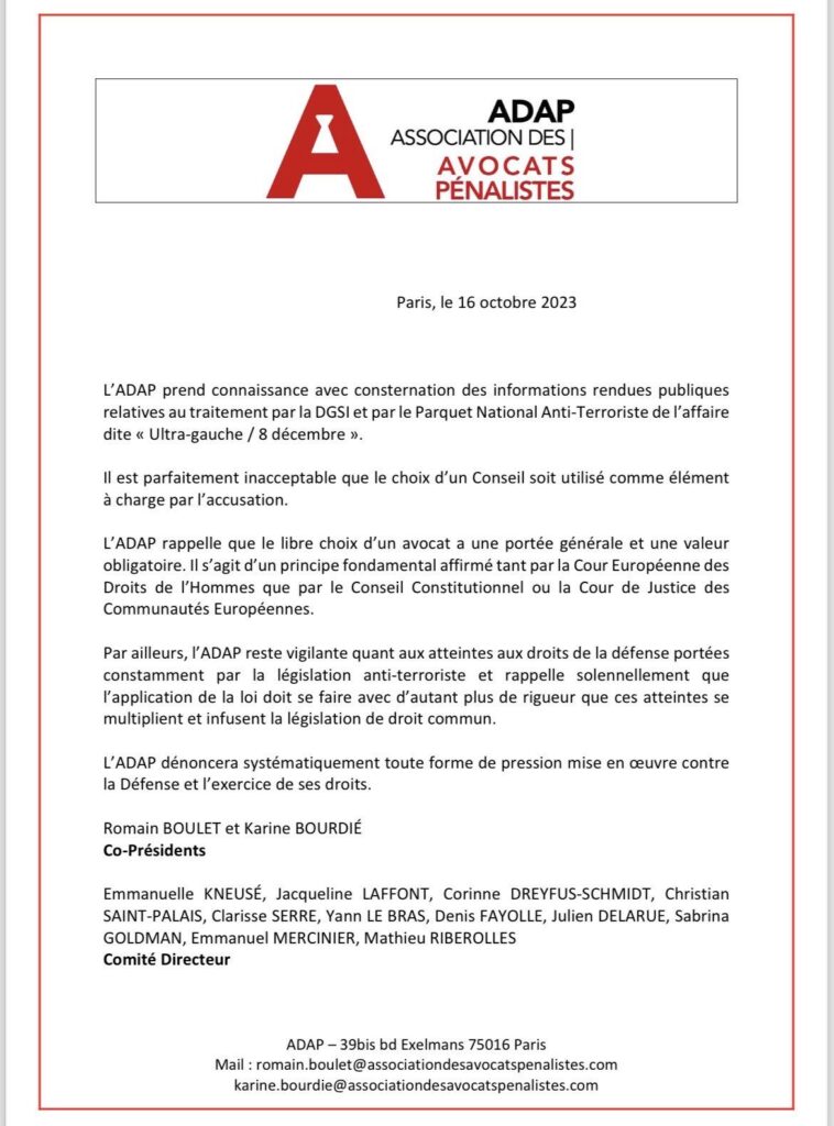 L’Association des Avocats Pénalistes dénonce : « toute forme de pression mise en oeuvre la Défense et l’exercice de ses droits.«