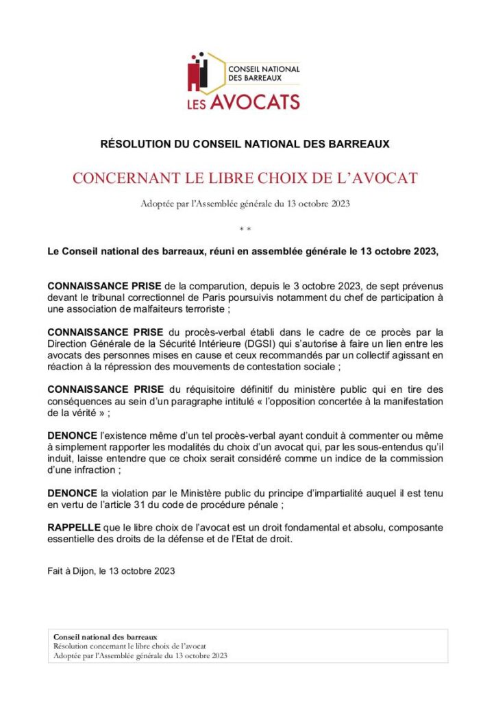 Le Conseil National des Barreaux dénonce : « l’existence même d’un tel procès-verbal ayant conduit à commenter ou même à simplement rapporter les modalités du choix d’un avocat qui, par les sous-entendus qu’il induit, laisse entendre que ce choix serait considéré comme un indice de la commission d’une infraction ; et la violation par le Ministère public du principe d’impartialité auquel il est tenu en vertu de l’article 31 du code de procédure pénale.«