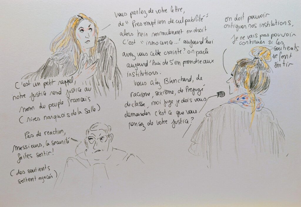 La juge assesseure va très vite laisser tomber les questions de personnalité pour s’enfoncer dans un face à face agressif : « La juge que je suis se doit de vous poser la question » assènera-t-elle avant de stupéfier la salle en s’écriant : « Le Tribunal rend la Justice au nom du peuple français ! ».