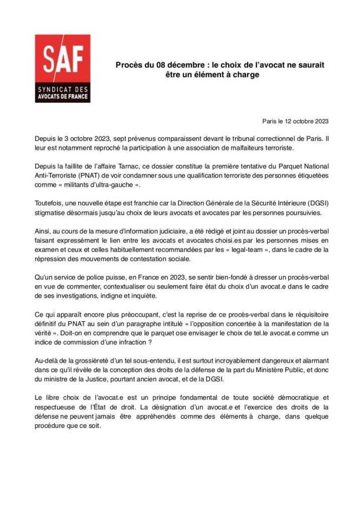 Le Syndicat des Avocats de France dénonce : « Au-delà de la grossièreté d’un tel sous-entendu, il est surtout incroyablement dangereux et alarmant dans ce qu’il révèle de la conception des droits de la défense de la part du Ministère Public, et donc du ministre de la Justice, pourtant ancien avocat, et de la DGSI.«