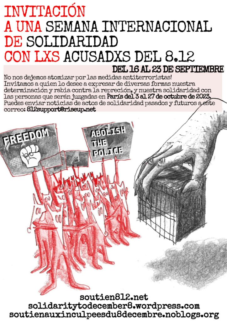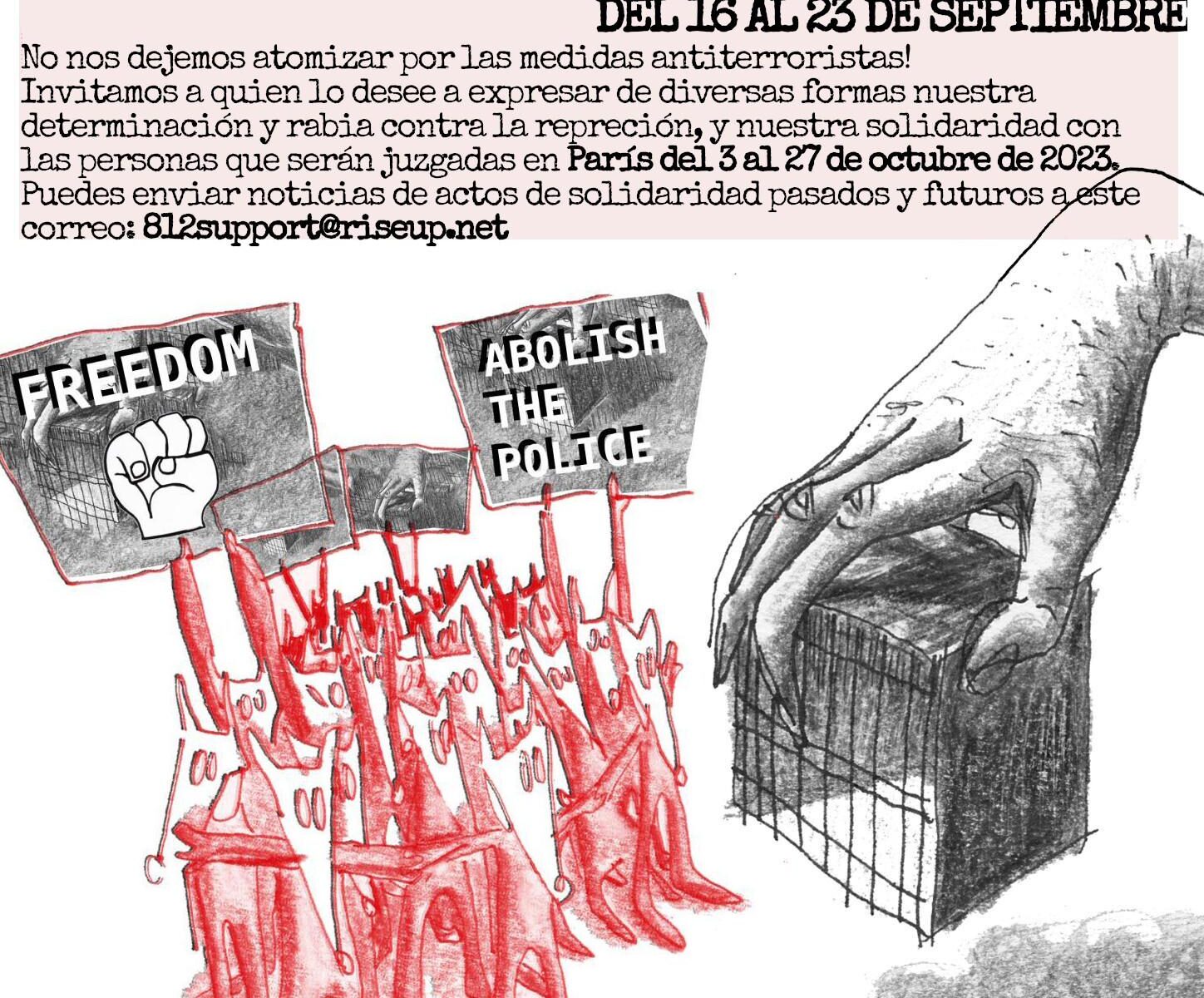 Les invitamos a hacer resonar en diversas formas nuestra determinación y nuestra rabia contra su mundo, y nuestra solidaridad con las personas que pasarán a juicio en París del 3 al 27 de octubre de 2023.