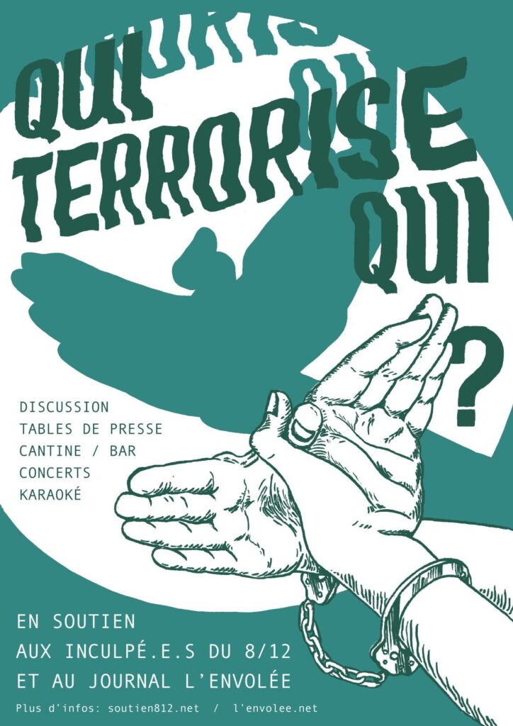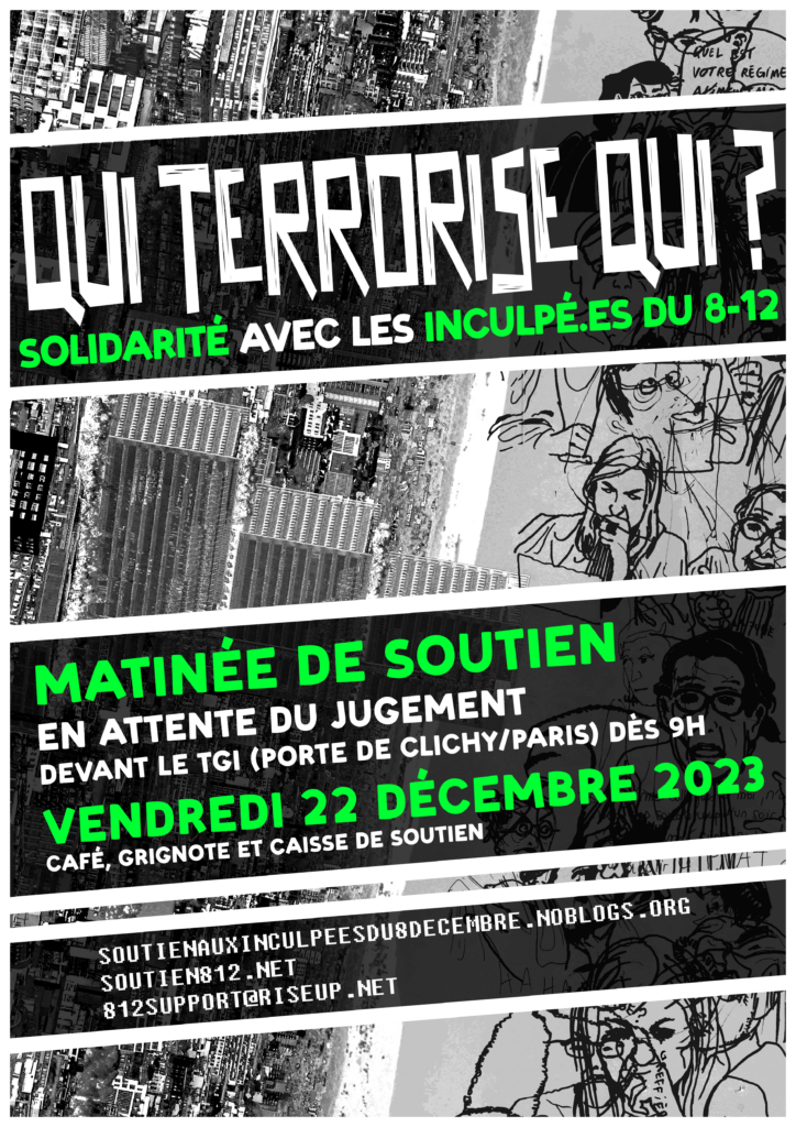 Ce n’est pas des individus qui sont visés mais toutes les personnes en lutte pour l’émancipation. Nous devons rester uni.es face à ces machines à broyer. Pour exprimer notre Solidarité avec les camarades du 8/12 et avec toutes les victimes de la répression :