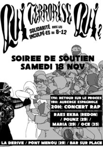 Le 8 décembre 2020, la DGSI arrêtait 9 militant·es libertaires prétextant une «opération antiterroriste». Ce «coup de filet dans «l’ultragauche» est un montage médiatique, juridique et policier qui n’a d’autre but qu’approfondir la militarisation de la répression sur les mouvements contestataires et d’assimiler l’idée de Révolution au Terrorisme. Après trois années de surveillance et d’instruction;Après l’utilisation …Continue reading « [Saint-Brieuc] Soirée de soutien aux camarades du 812 »