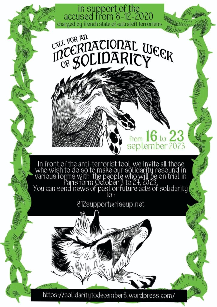 We invite you to echo in various forms our determination and rage against their world, and our solidarity with people who will go to trial in Paris from October 3 to 27, 2023.