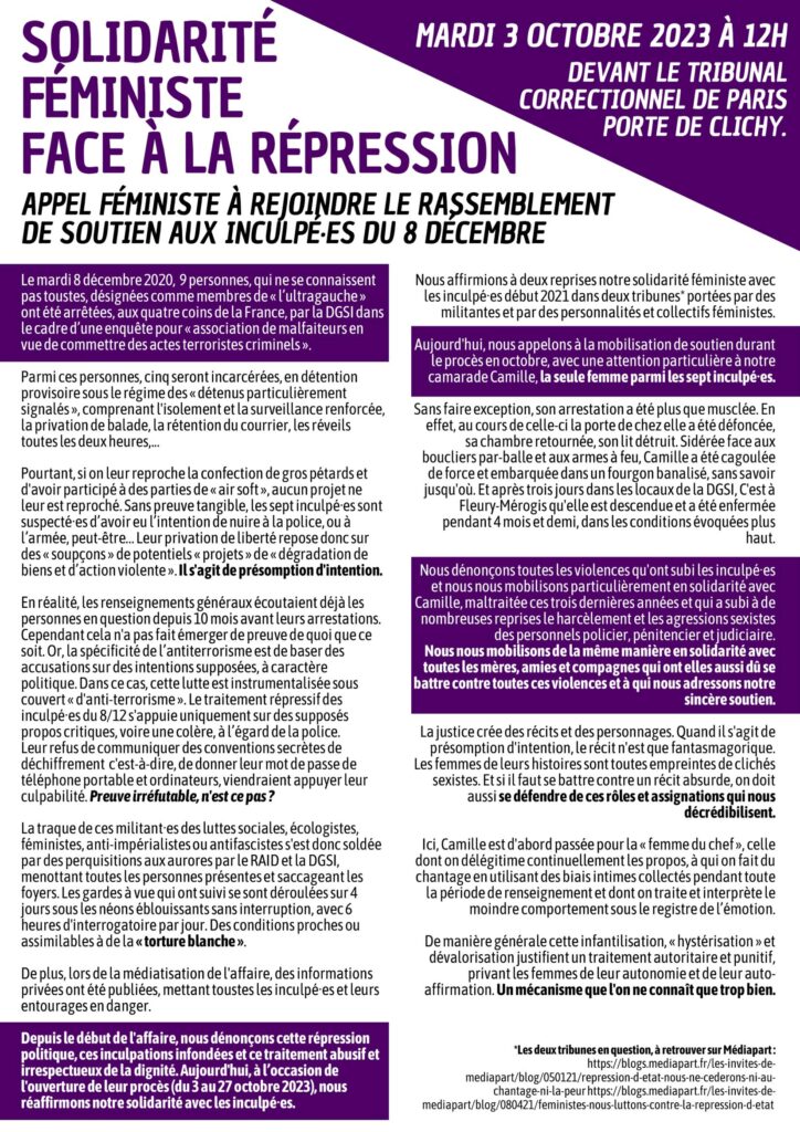 Plus besoin de preuves, des soupçons suffisent. Les inculpé·es le sont sur la base d’intentions supposées. Nous dénonçons cette justice politique où l’arbitraire règne. Nous dénonçons l’utilisation de l’étiquette terroriste pour justifier un traitement policier et judiciaire d’exception contre le mouvement social et tenter de le diviser.