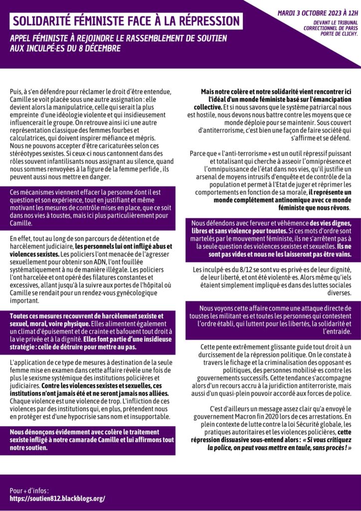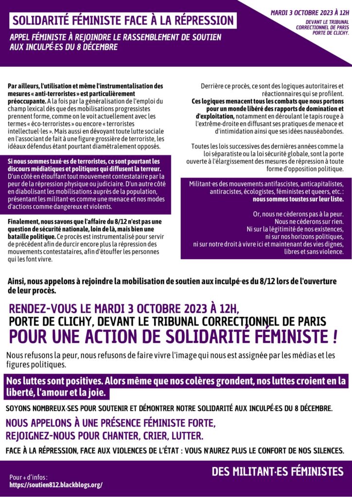 Face à ces attaques, notre meilleure arme est la solidarité. Faisons-la vivre en disant notre refus de cette justice d’exception et en témoignant notre soutien à celles et ceux qui la subissent. Pour cela, nous appelons à un rassemblement le 3 octobre à 12h30 devant le tribunal de Saint-Brieuc.