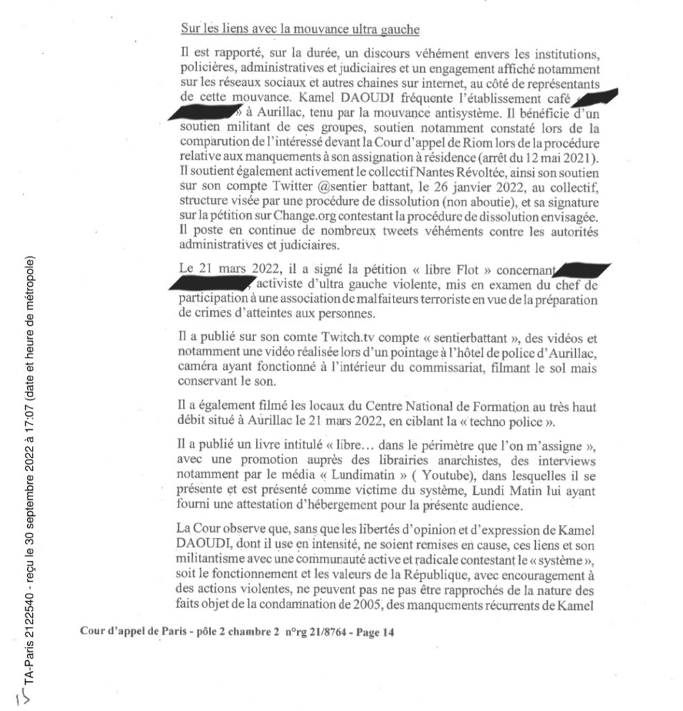 En juin 2022, la cour d’appel de Paris utilisait la situation de Libre Flot et la tentative gouvernementale de dissolution de Nantes Révoltée pour perpétuer l’acharnement administratif contre Kamel Daoudi, assigné à résidence depuis… 14 ANS!