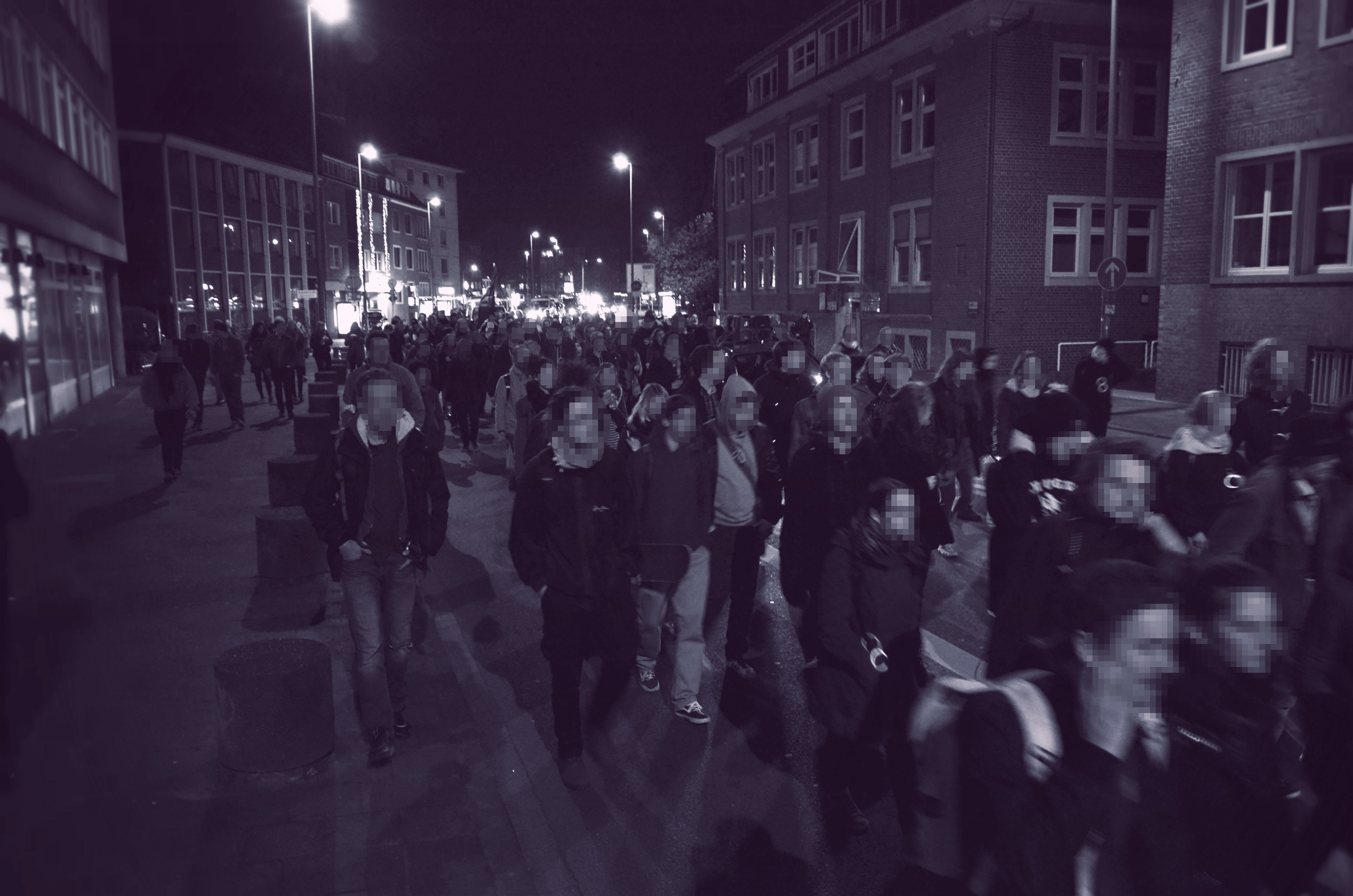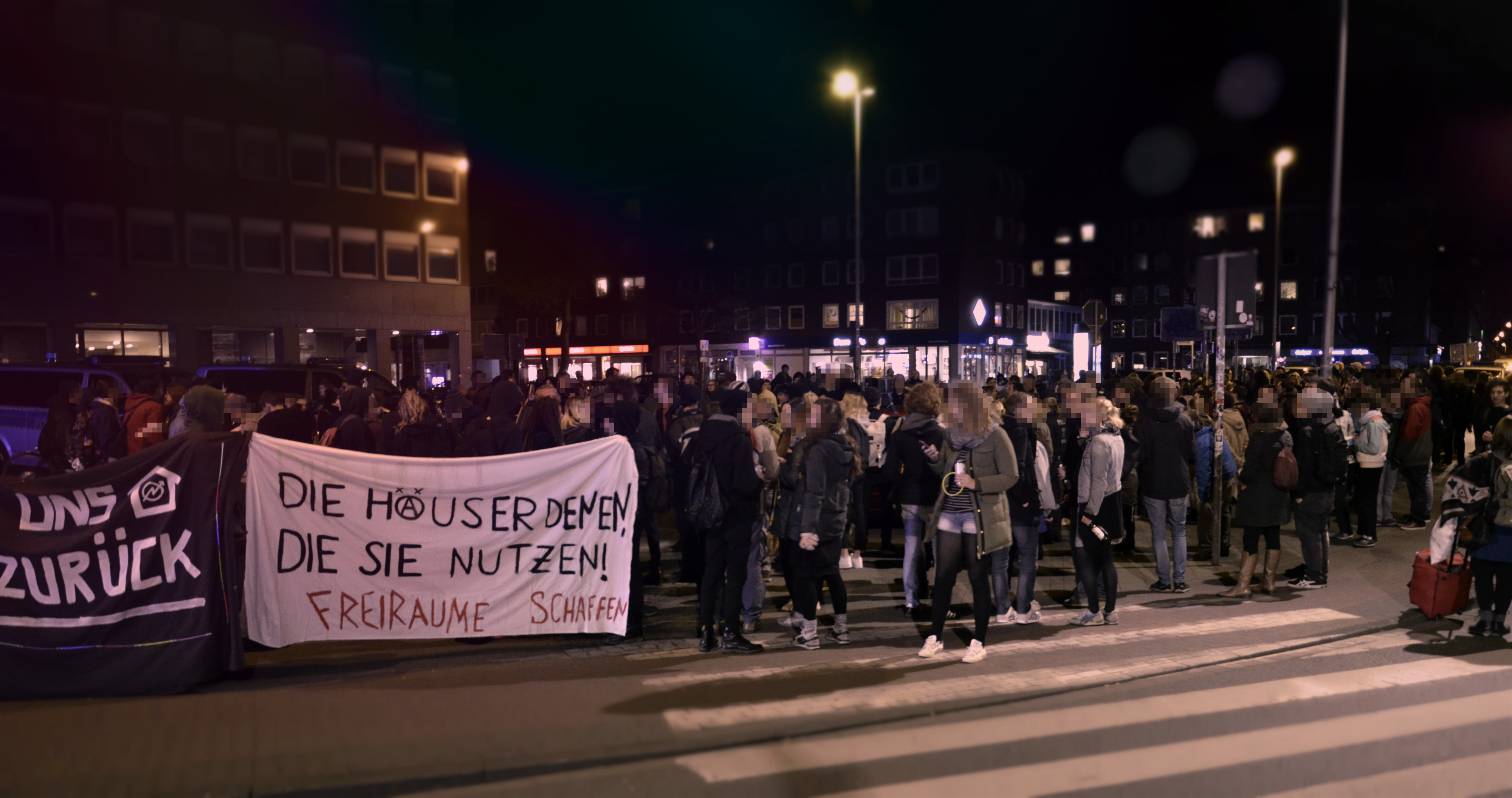 Auf dem Bremer Platz versammelten sich gegen 19:30 Uhr die Teilnehmer*innen der Nachttanzdemo und starteten, nachdem die technischen Probleme beseitigt waren, enthusiastisch und entschlossen Richtung Innenstadt. Begleitet wurde die Nachttanzdemo durch ein unangemessen hohes Polizeiaufgebot von ca. 25 Polizeiwannen, welches ganz deutlich zur Einschüchterung eingesetzt werden sollte.