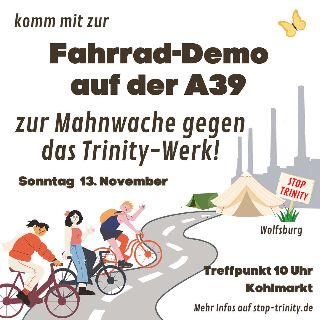 Die Widerstandsbewegung gegen die A39 und Aktivist*innen, die gegen die neue VW-Autofabrik Trinity in Wolfsburg aktiv sind, planen gemeinsam eine Fahrraddemo von Braunschweig nach Wolfsburg auf der A39 zum geplanten Trinity-Baugelände.
