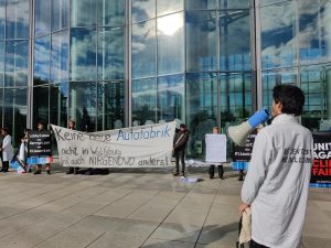 Verkehrswende-Aktivist*innen aus Wolfsburg, die gerade in Protesten gegen die neue Trinity-Fabrik von Volkswagen aktiv sind, unterstützen die Aktion.