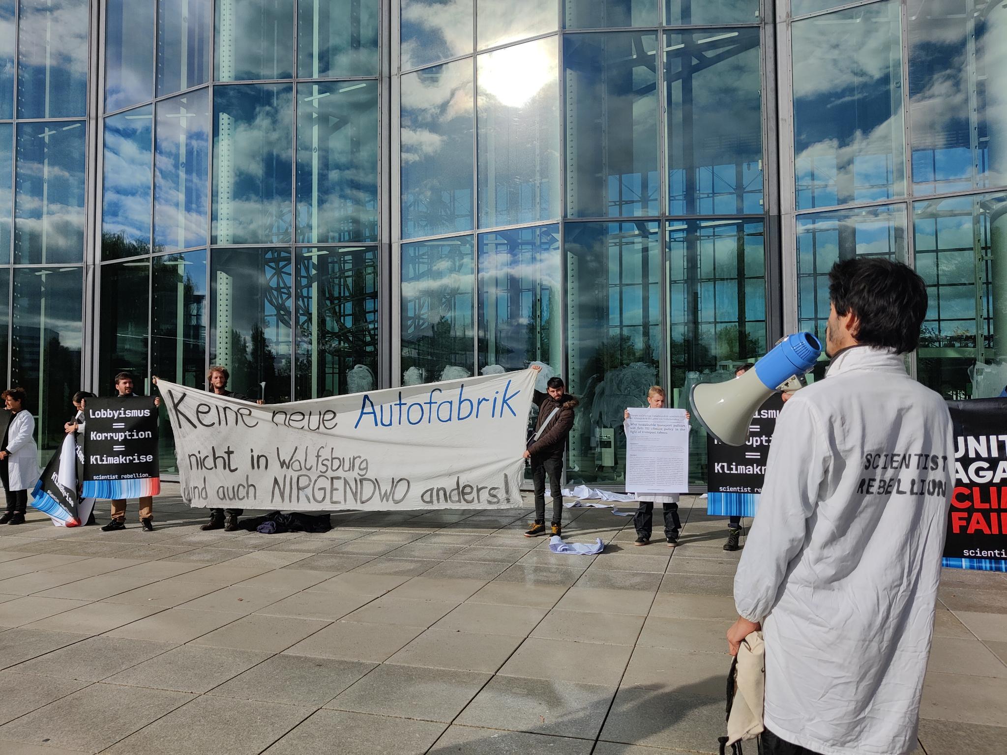 Unter dem Motto “decarbonize transport” fanden heute Aktionen der Scientist Rebellion vor und in der Autostadt statt. Vor der Autostadt wurde Kunstblut ausgekippt und wissenschaftliche Papiere auf Fenster der Autostadt-Empfangshalle geklebt, die auf die dringende Notwendigkeit einer Verkehrswende hinweisen. Auch in der Autostadt – im Porsche-Pavillion – fanden Aktionen statt.