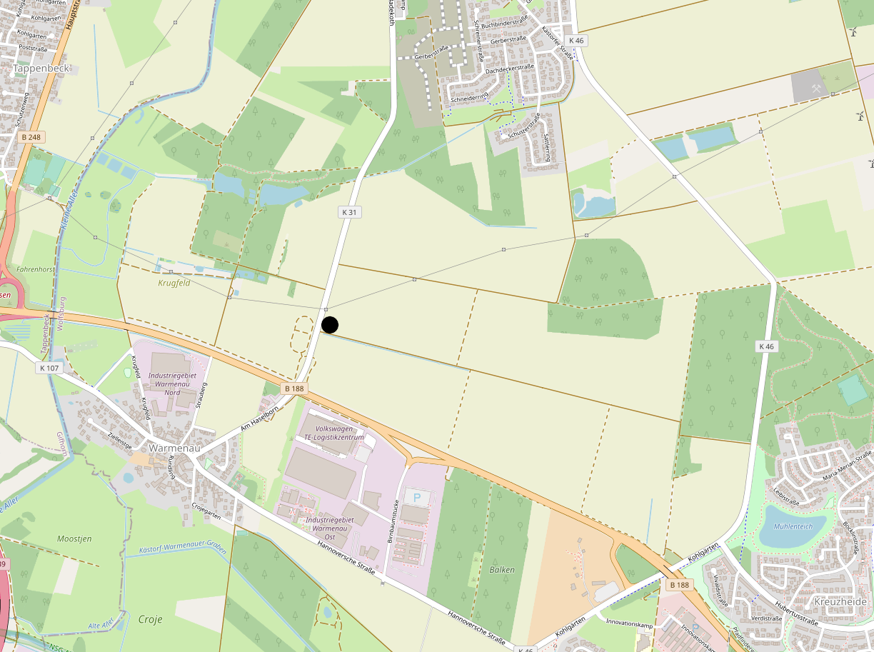 Die Mahnwache ist auf dem Feld nördlich Fahrradwegs, der nach Osten von der K31 zwischen Warmenau und Brackstedt nach Kästorf abbiegt (Koordinaten: 52.4609,10.7583).