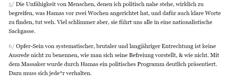 Gleichzeitig gäbe es aus linker Perspektive keinen Weg darum herum, eine Position politischer Trauer zu den Gräueltaten der Hamas zu entwickeln – selbst wenn diese von der politischen Rechten in Israel für die eigene militaristische Agenda genutzt werden könne – und auch wenn es einen seit Jahren innerisraelisch kritisierten, politischen Besatzungs- und Entrechtungskontext auf Seiten der Palästinenser gebe. Letzterer rechtfertige jedoch nicht die Massaker der Hamas in Israel: