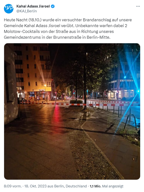 Auch wenn es meines Erachtens Bezugspunkt einer linkspolitischen Debatte sein muss, die politischen Äußerungen zum gegenwärtig eskalierenden Nahost-Konflikt zu verstehen und zu gewichten, gibt es doch Handlungen in den letzten 3 Wochen in Deutschland, die unmissverständlich geächtet gehören. Hierzu gehören aus meiner Sicht die physischen Angriffe auf jüdische Einrichtungen, am prominentesten der versuchte Brandanschlag auf die jüdische Gemeinde Kahal Adass Jisroel in Berlin-Mitte am 18.10.2023.