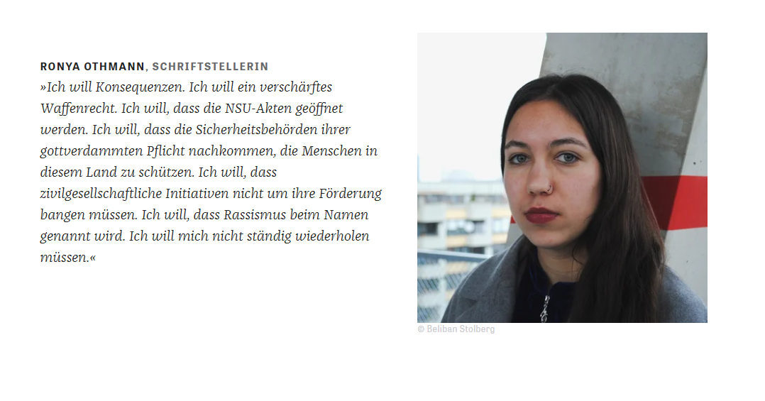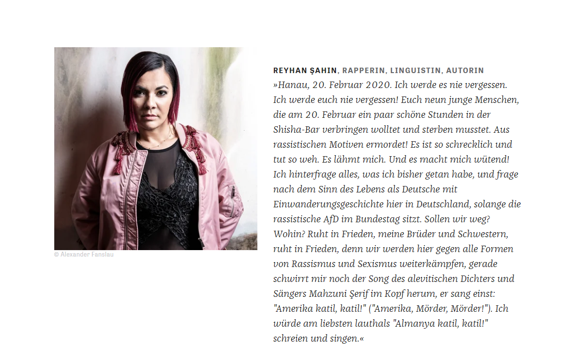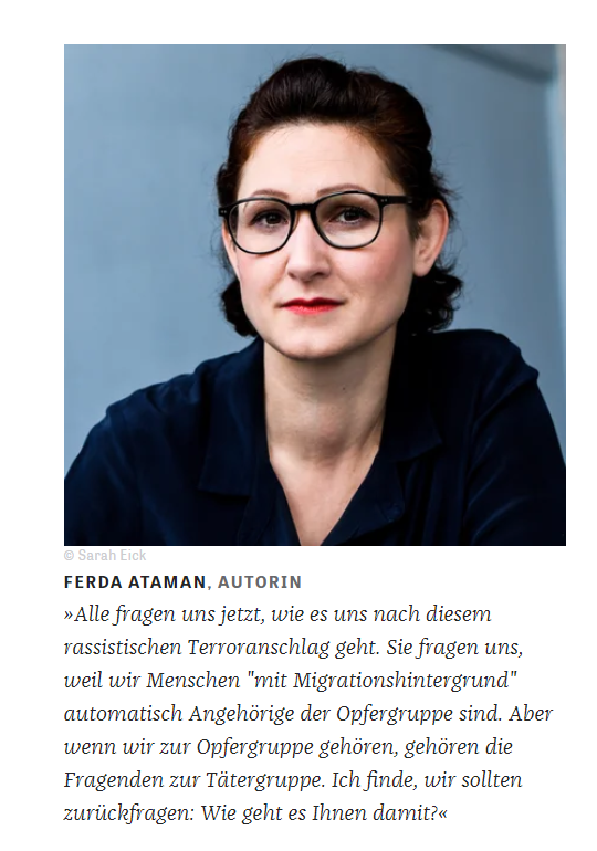 “Schade, dass die Kanzlerin nicht da ist. Dass sie nicht nach Hanau fährt und die Eltern in den Arm nimmt. So wie damals die neuseeländische Premierministerin Jacinda Ardern in Christchurch. Die band sich ein Kopftuch um (obwohl das keiner der Hinterbliebenen erwartete), ging in die Al- Noor Moschee, dem Tatort und nahm die hinterbliebenen Frauen in den Arm. […] Warum geht die Kanzlerin nicht zu den Opfern? Warum konnte sie nach dem Attentat auf die Synagoge in Halle am gleichen Abend in die Neue Synagoge in der Oranienburgerstraße gehen? Und jetzt nach Hanau geht sie nirgendwohin? Wieso ist niemand von der Regierung zu den Opfern gegangen? Warum hat der Bundespräsident Frank-Walter Steinmeier in Hanau auf einem Marktplatz gesprochen und die Hinterbliebenen waren gezwungen ihm zu applaudieren? Warum ist er nicht zu den Hinterbliebenen nach Hause gegangen und hat ihre Hand gedrückt? Warum steht er auf dem Marktplatz und legt Blumen auf den Boden, wo doch die Eltern ein paar Hundert Meter weiter wohnen. Da geht man doch hin und klingelt. Und entschuldigt sich für das Fehlen der Kanzlerin, richtet Grüße aus, zieht die Schuhe aus, setzt sich ins Wohnzimmer und trinkt gemeinsam mit ihnen Tee. Und so macht man das bei allen Familien der Hanauer Bürger, die starben. Das waren nämlich, bis auf den Rumänen, der war dienstlich in Deutschland, alles Hanauer Bürger.” –> LINK ZUM ARTIKEL