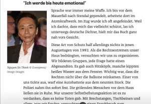 “Wie Nguyen Do Thinh, ein Bewohner des Sonnenblumenhauses, unlängst in einem Interview mit »Zeit-Online« betonte, war es vor allem die entschlossene und disziplinierte Gegenwehr der Vietnames*innen selbst, die eine Erstürmung des Hauses und letztlich den Tod von über 100 Menschen verhinderte und schließlich auch die Flucht vor dem Feuer über das Dach ermöglichte. Nur wenige Tage später gründeten die Überlebenden den Verein Diên Hông – Gemeinsam unter einem Dach, der bis heute eine maßgebliche Rolle bei der Aufarbeitung dieses Pogroms spielt.” [–> LINK ZUM ARTIKEL]
