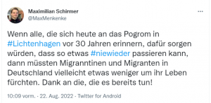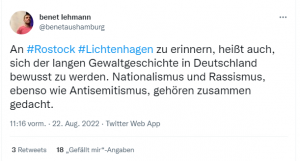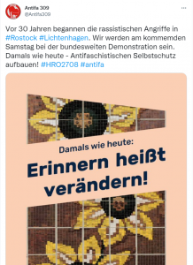 Ich habe mal auf social media nach posts geschaut, die sich mit der linken Erinnerung an die Pogrome von Rostock und Schlüssen für die heutige politische Situation in Deutschland auseinandersetzen. Hier eine kleine Auswahl: