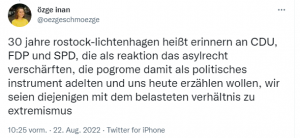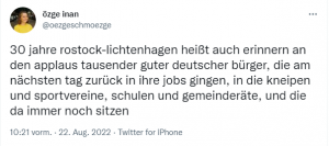 “Statt das Geschehen von den Tätern und ihren Taten her zu erzählen, sollten wir es von den Opfern her aufschlüsseln. Und statt Lichtenhagen bloß als ostdeutsche Geschichte zu verstehen, sollten wir die Kontinuitätslinien nachziehen, die nicht nur in die DDR, sondern gerade auch in die alte Bundesrepublik führen. Denn der Diskurs über Ost- als Dunkeldeutschland bot und bietet eine bequeme Ausrede, sich nicht mit dem spezifischen Rassismus Westdeutschlands auseinandersetzen zu müssen, der vor allem in den Achtzigerjahren virulent wurde. Mit der Vereinigung wuchsen dann der ostdeutsche und der westdeutsche Rassismus zusammen, verstärkten einander und stießen eine Gewaltdynamik an, die beide Teile Deutschlands erfasste und bis heute prägt.” [–> LINK ZUM ARTIKEL]