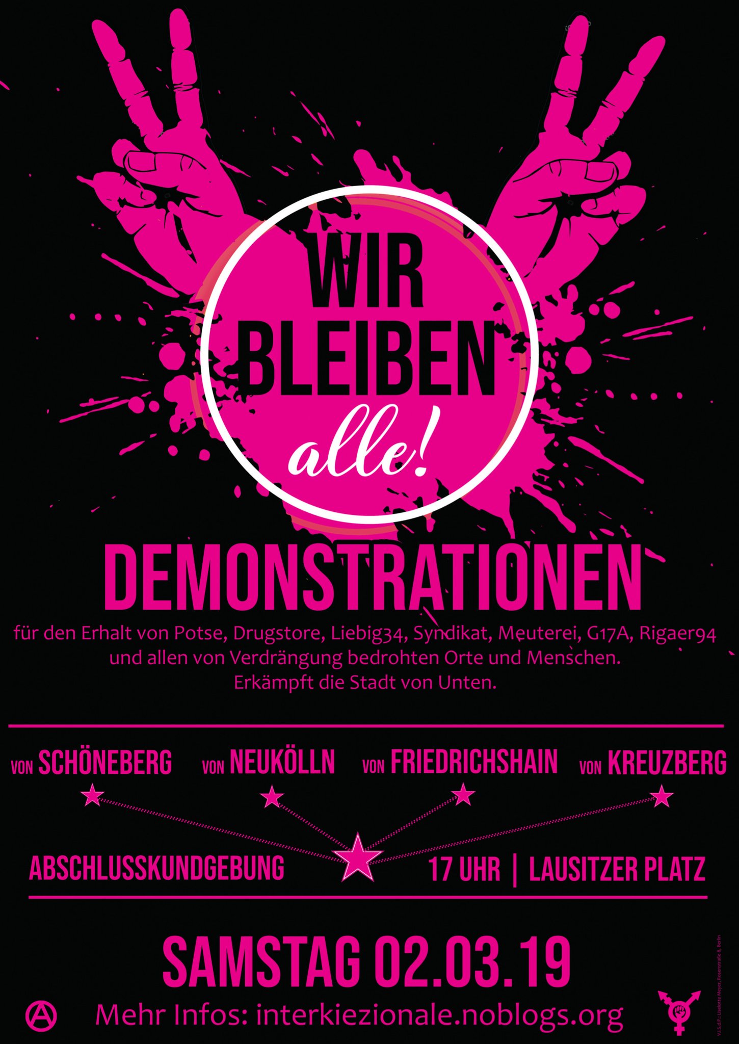 Am Samstag finden unter dem Motto “Hoch die interkiezionale Solidarität” in unterschiedlichen Bezirken Berlins Demos gegen Gentrifizierung, steigende Mieten und die erzwungene Schließung von Kiezkneipen statt. Die Demos treffen sich schlussendlich am Lausitzer Platz in Kreuzberg. Aus dem Aufruf: “Seit Jahresbeginn haben Liebig34, Syndikat & Potse keine Verträge mehr. Seitdem besetzen die Kollektive ihre Räume. Bald laufen auch der Vertrag der Meuterei & die Duldung der G17A aus. Zeigt euch solidarisch und kommt zur Interkiezionalen diesen Samstag! #WirBleibenAlle” –> Link
