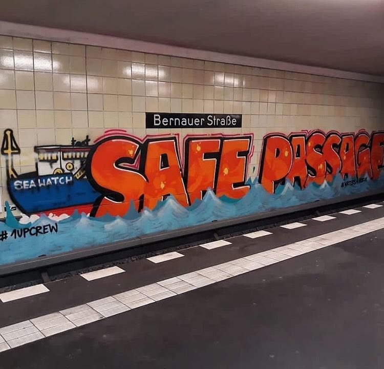 Am U-Bahnhof “Bernauer Strasse” hat jemand die Forderung nach sicheren und legalen Möglichkeiten zum Grenzübertritt für Geflüchtete gesprayt: