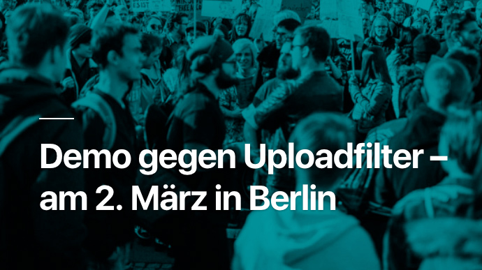 Auf europäischer Ebene gibt es momentan massive Auseinandersetzung um die Einführung von sog. Upload-Filtern, die von den Platformbetreibern wie Youtube, Facebook u.a. eingebaut werden sollen, um Inhalte kontrollieren zu können. Ein Bündnis digitaler Bürger*innenrechts-Gruppen ruft deshalb für Samstag, den 2.3.2019 um 13 Uhr zur Demo auf: “Mit der Urheberrechtsrichtlinie, über die das europäische Parlament bald abstimmen wird, werden Online-Plattformen verpflichtet, Uploadfilter einzuführen, die urheberrechtlich geschützte Inhalte erkennen und blockieren sollen. Uploadfilter sind Black Boxes, die die Informationsfreiheit im Internet einschränken. Sie verstehen den Kontext von Inhalten nicht, werden das Teilen von Informationen mit Links und kurzen Teasertexten verhindern und Memes, Parodien und Adaptionen blockieren.” –> Link