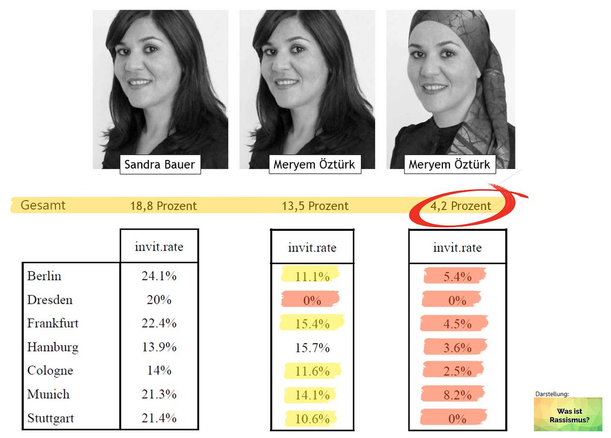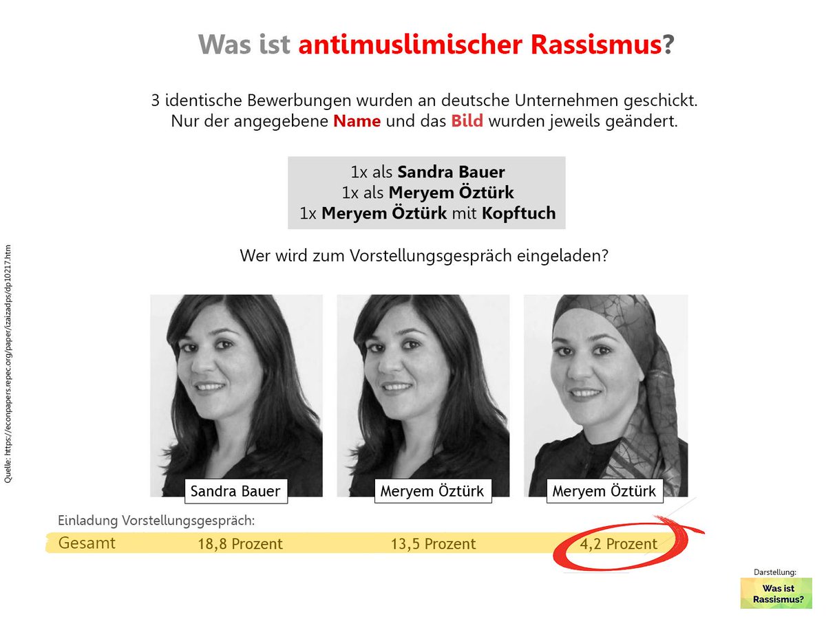 Es ist eine neue sozialwissenschaftliche Studie zu anti-muslimischem Rassismus erschienen, die sich mit Diskriminierungsstrategien auf dem deutschen Arbeitsmarkt beschäftigt. Der Twitteraccount von “Was ist Rassismus?” fasst die Fragestellung und Durchführung der Studie zusammen (–> LINK): “Antimuslimischer Rassismus mitten in Deutschland? 3 Bewerbungen an dt. Unternehmen: 1x als Sandra Bauer / 1x als Meryem Öztürk / 1x als Meryem Öztürk + Hijab. Wer kommt eine Runde weiter?”. Hier folgend die ernüchternden Ergebnisse als Schaugrafik, die ausführliche Studie findet ihr hier –> LINK