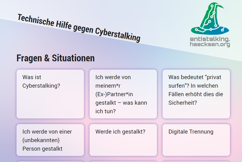 Anne erwähnt auch eine sehr gut gemachte Beratungs-Seite gegen digitales Stalking, gemacht von dem feministischen “Haecksen”-Kollektiv. Sieht super aus, see here [–> LINK ZUR WEBSITE]