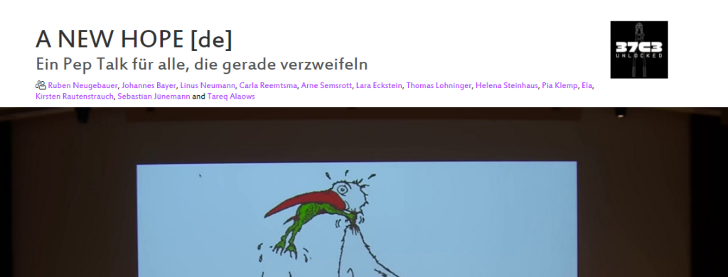 Auch wenn der CCC viel aus der Weitergabe von technischer Expertise besteht, gibt es auch explizite politische Panels wie den Pep Talk “A new Hope”, der Aktivist*innen aus unterschiedlichen Feldern zusammenbrachte und darüber reden liess, was Ihnen für die nähere Zukunft noch politische Hoffnung gibt. Herausgekommen ist ein wie ich finde sehr gutes Zusammenspiel der Situation in den unterschiedlichen Bewegungsteilen.