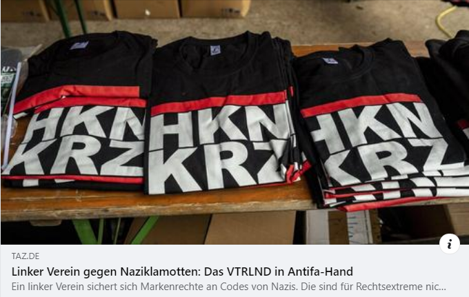 Es ist wahrscheinlich momentan nicht mehr als ein Stöckchen zwischen die Beine der Rechten, aber trotzdem gut: die linke Kampagne “Laut gegen Nazis” sichert sich gerade die Markenrechte für rechte, abgekürzte Slogans auf T-Shirts und mahnt dann rechte Versandhandels-Platformen wegen Verletzung der Markenrechte ab. Gibt dann wohl mehr Geld für Antifa e.V. 😉 [–> LINK ZUM ARTIKEL]